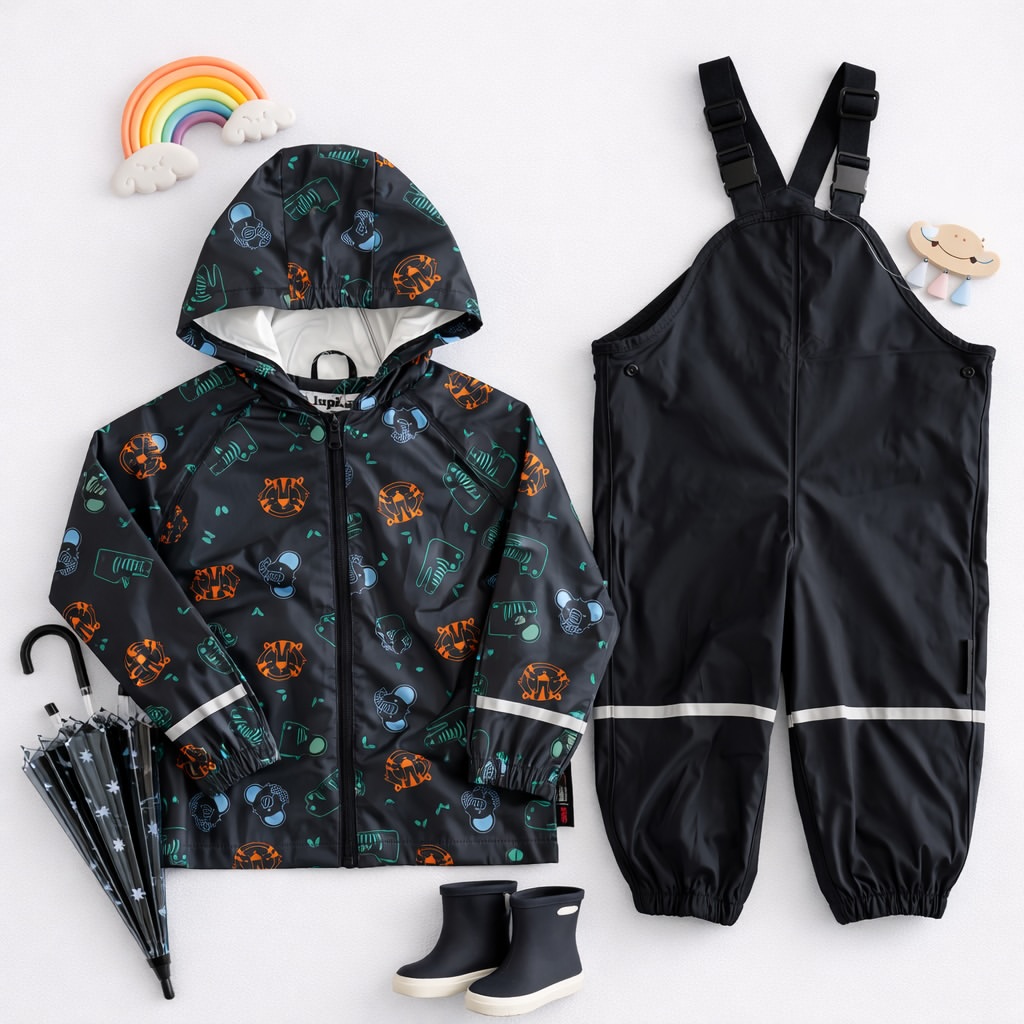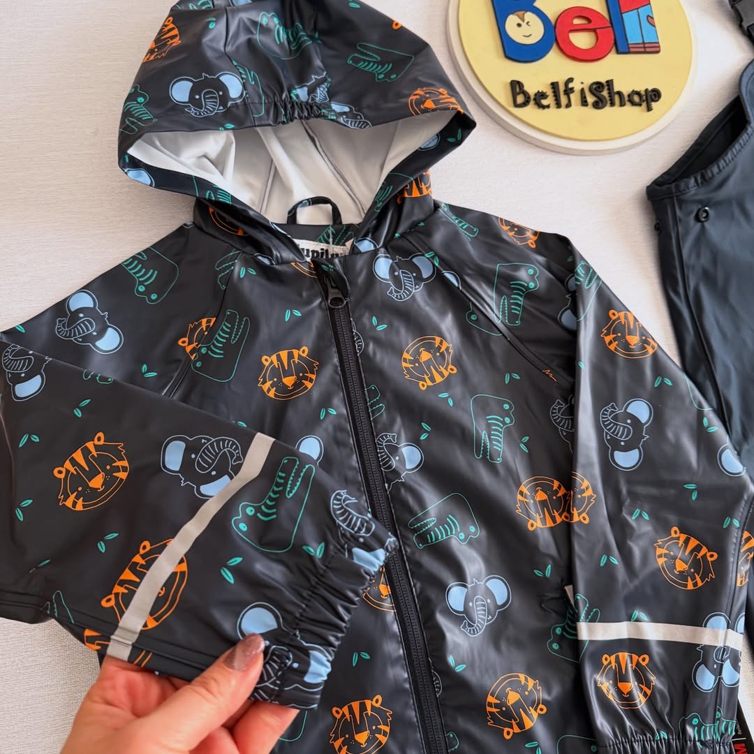 ست بارونی شلوار ضد آب بدون پلار یه کار عالی و کاربردی مناسب چهار فصل برای بچه ها. جنس رویه کاملا ضد آب و بادگیر کلاهدار، دارای نوارهای شبنما و زیپ با محافظ چانه.