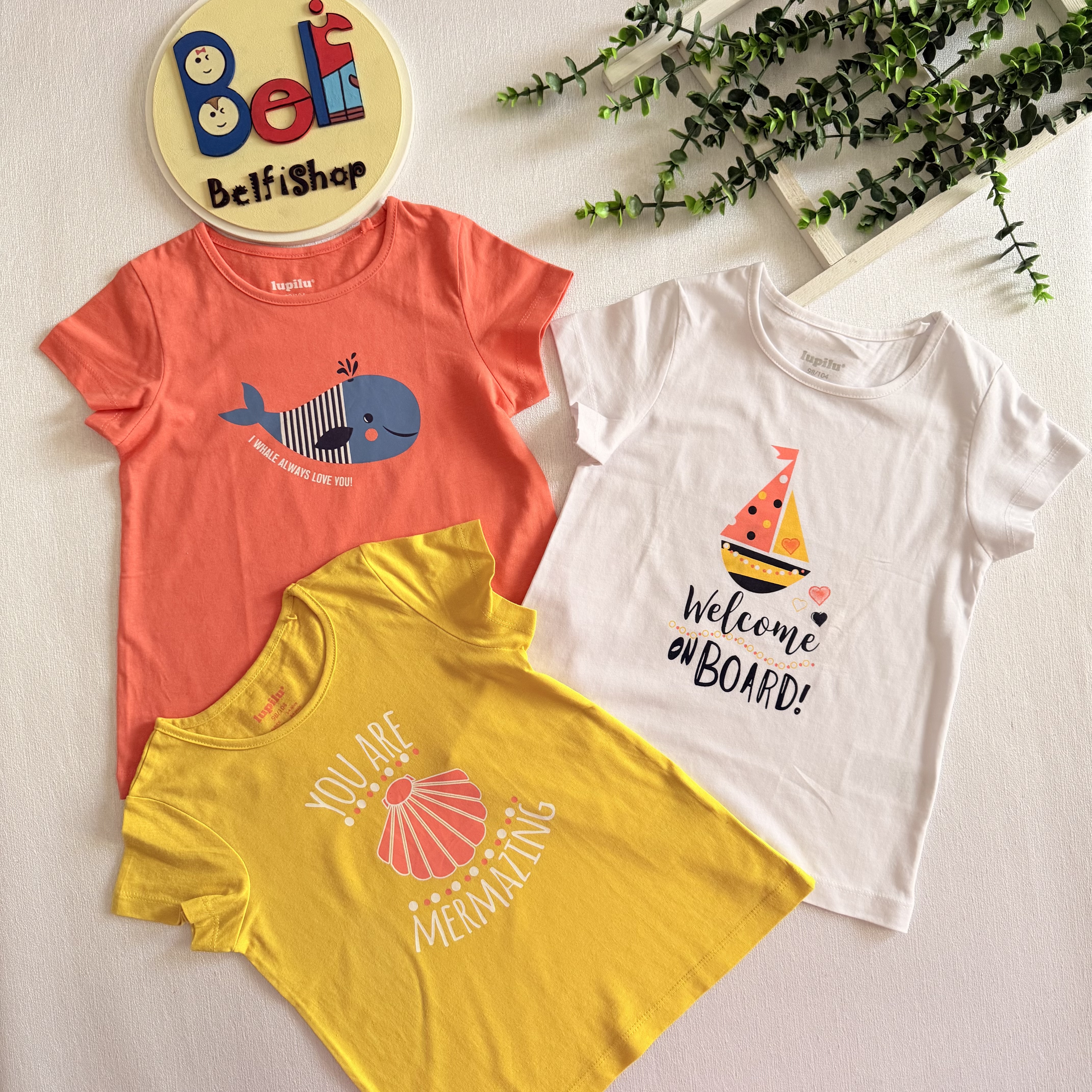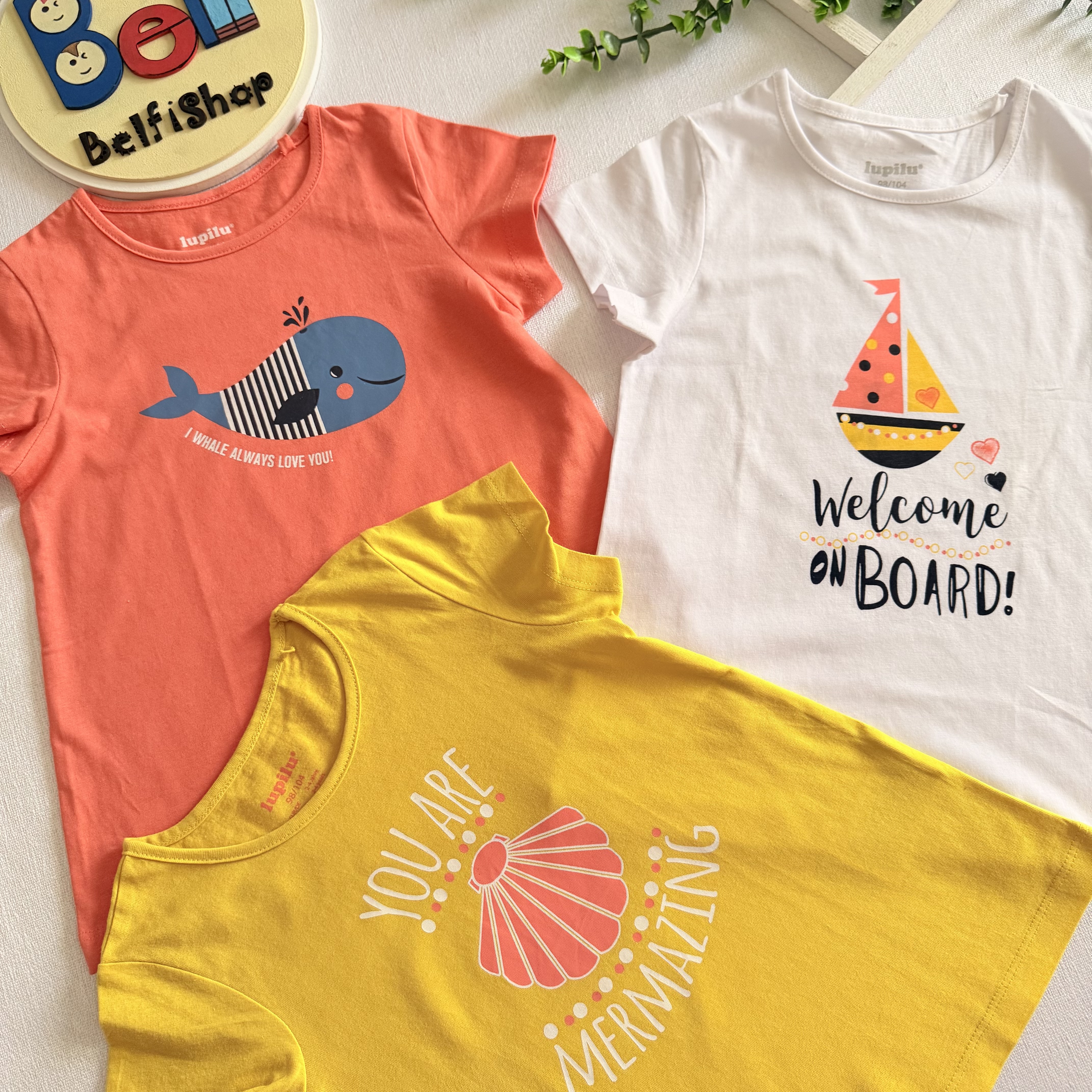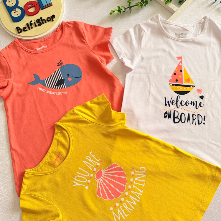 پک سه تایی تیشرت نخی دخترانه برند لوپیلو جنس تمام نخ بسیار نرم و لطیف دارای استاندارد اتحادیه اروپا دارای طراحی زیبا در سه طرح کاربردی مناسب استفاده روز مره ، بیرون و مهد